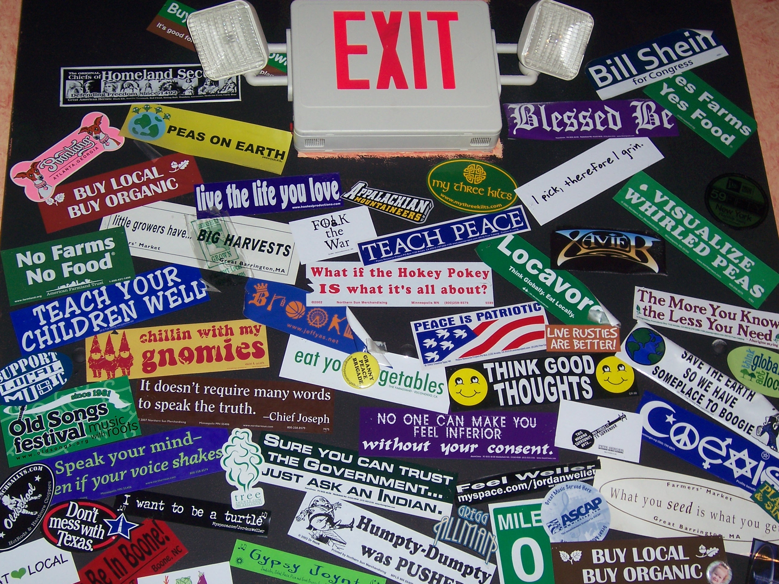 Now I need to find a similar collage of conservative stickers. Will those stickers be as idealistic, as upbeat, as focused on sustainable food and education and music and peace?