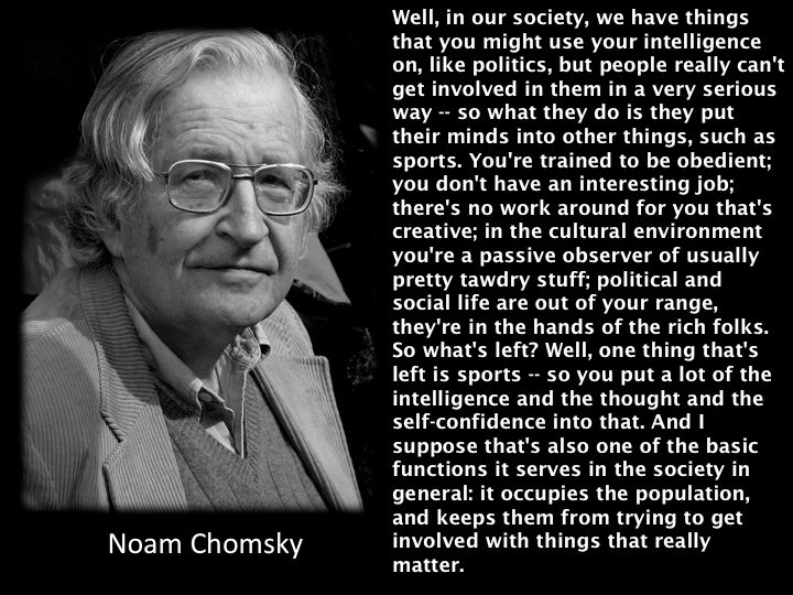 At no point does any of this paint spectator sport a conspiracy seeking to keep people ignorant. I watch sports most weekends, but I hope you can see that I am not ignorant! I would argue that it is entertainment with the potential for catharsis and even wider engagement.