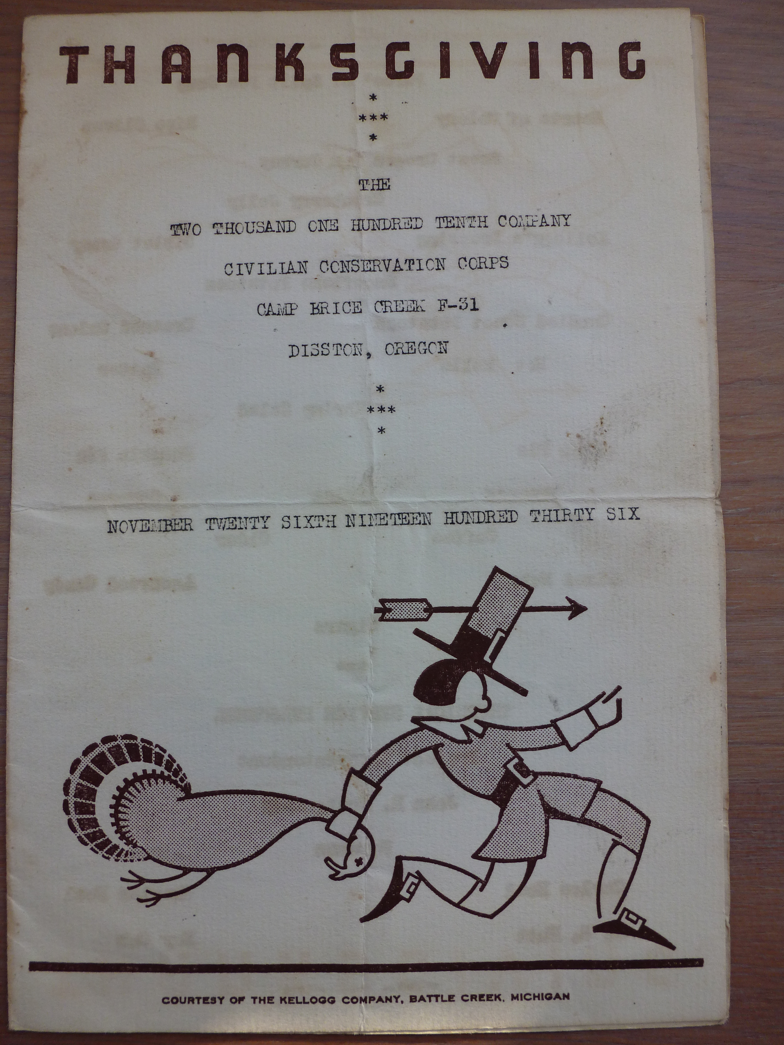 In 1936, my dad was nineteen and serving in the Civilian Conservation Corps during the Great Depression, fighting forest fires in Oregon. Due to a dry summer, 1936 was an especially bad year for fires, and my dad fought a killer one at Bandon-by-the-Sea in Oregon. After a tough fall, he and his fellow CCC boys sat down to a well deserved Thanksgiving Dinner at Camp Brice Creek in Disston, Oregon. My dad was a pack rat who saved everything, so I have the menu from that Thanksgiving Day.