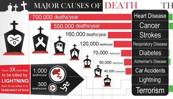 The statistical record of deaths by other means is beside the point because they are insufficient to explain human events steeped in emotion, current events and history. The attackers in killings, such as in Paris recently, often fervently claim allegiance to Islam. Is it for non-Moslems to deny or minimize their adherence to a distorted Islam or is for Moslems to do so because it is their religion? Also the number of people and organizations involved in wanting to strike at American and European targets is sufficiently large to activate considerable defenses against them. Do we want to say they are a minor threat which requires minimal action for prevention?